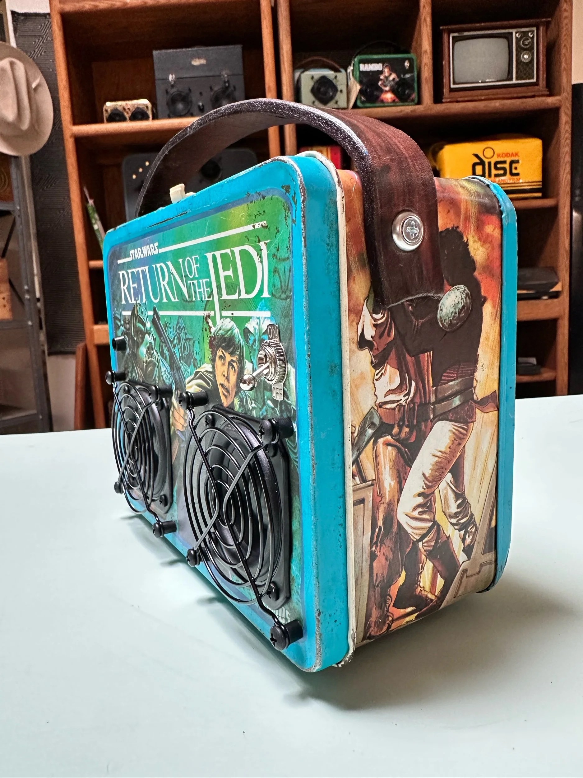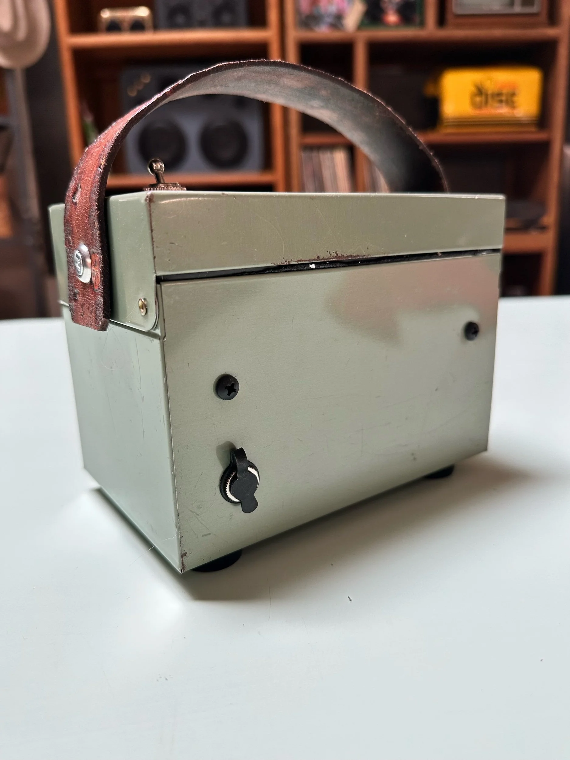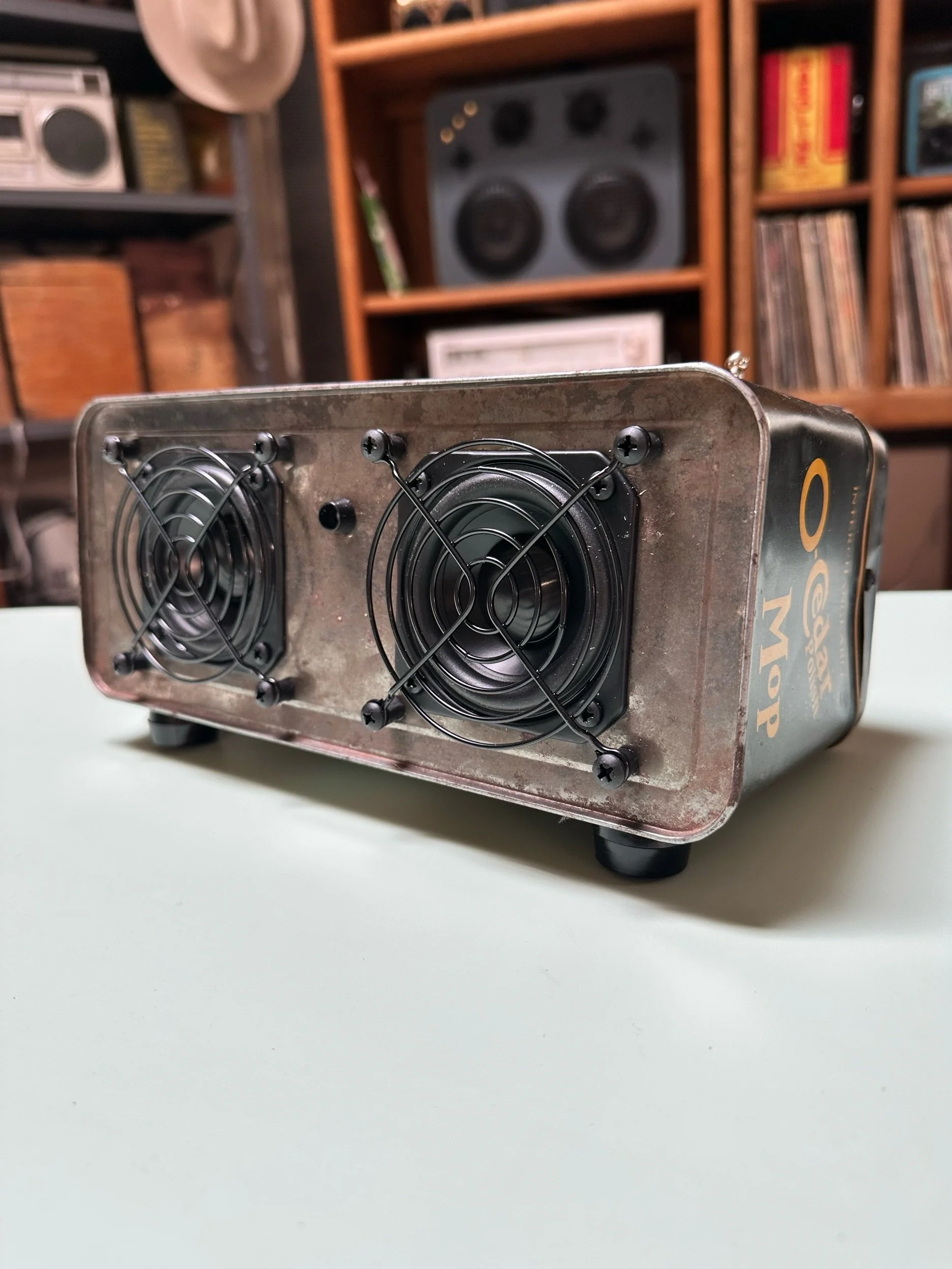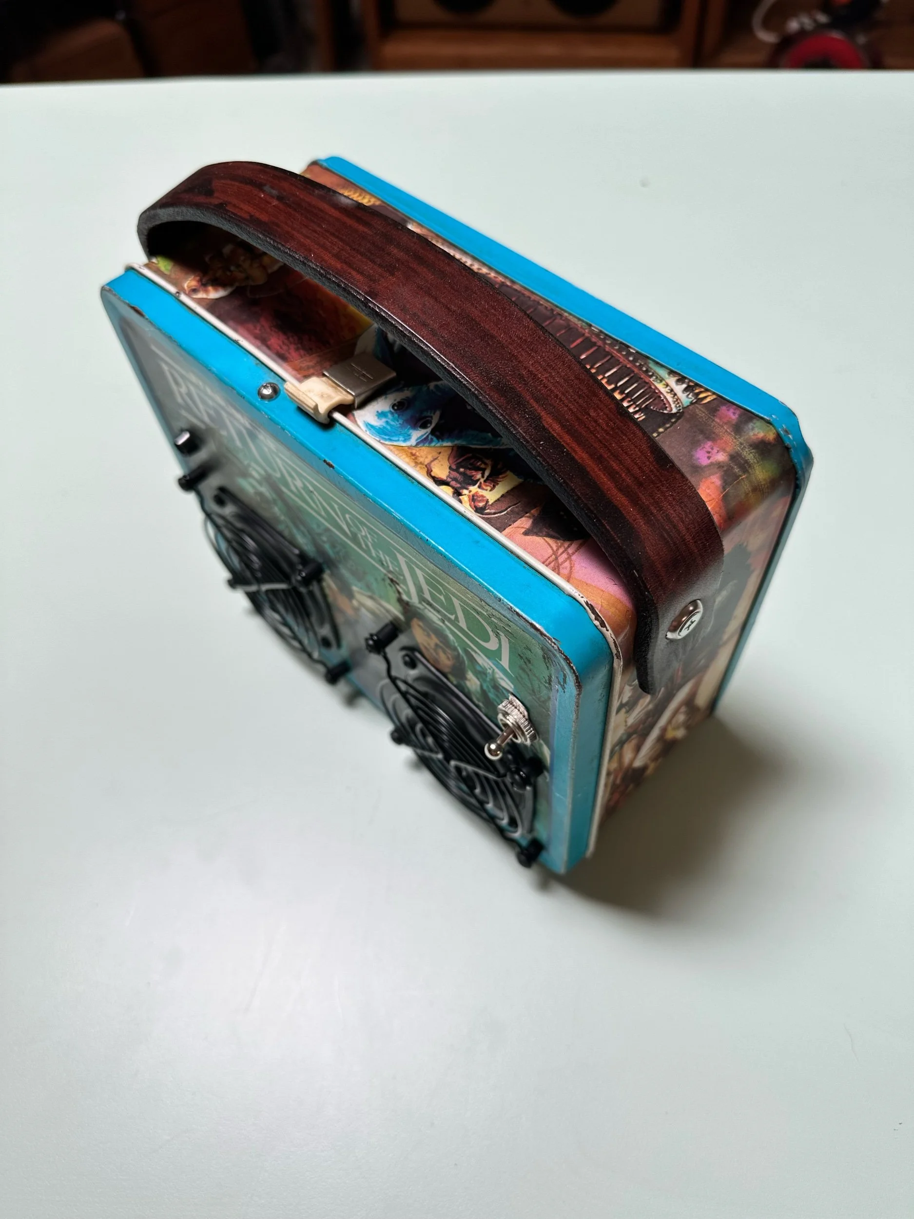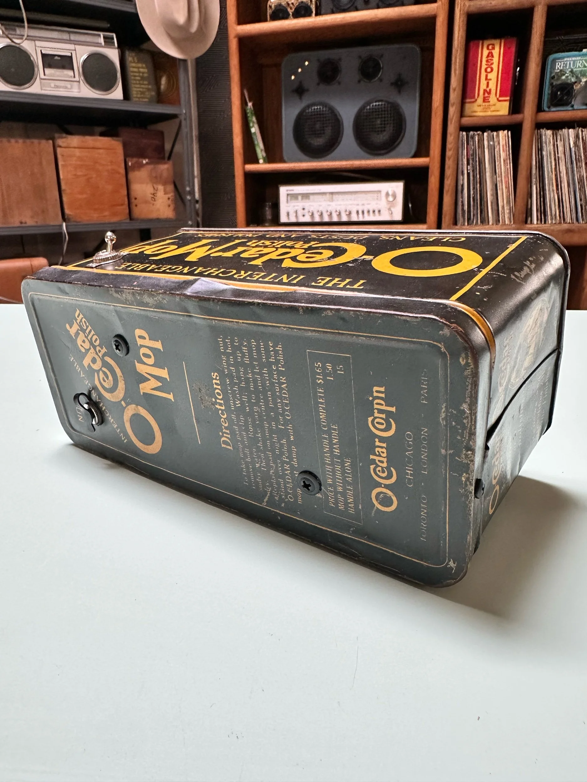 Crafted from a vintage lunch box. This one in particular was very well loved which adds to it’s charm. We only use vintage lunch boxes that do not have much value on their own so as not to upset any collectors. These are cleaned, re sealed and meticulously insulated to create a warm sound in a metal box.