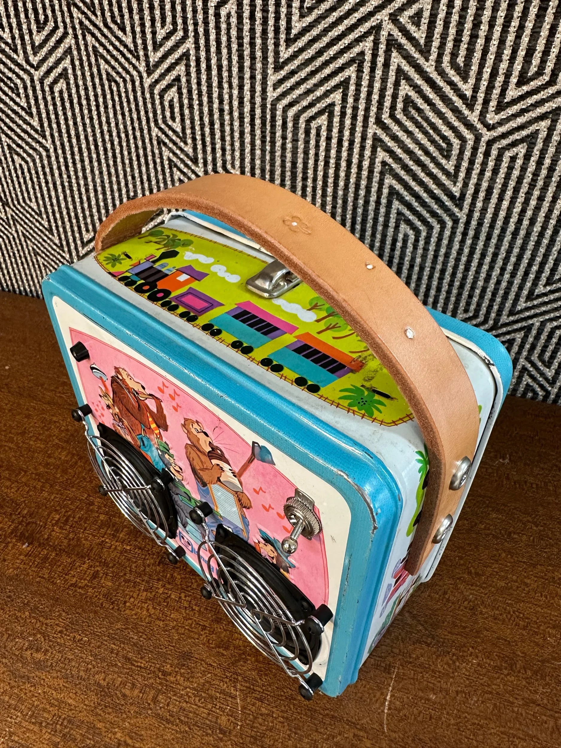 Crafted from a vintage lunch box. This one in particular was very well loved which adds to it’s charm. We only use vintage lunch boxes that do not have much value on their own so as not to upset any collectors. These are cleaned, re sealed and meticulously insulated to create a warm sound in a metal box.