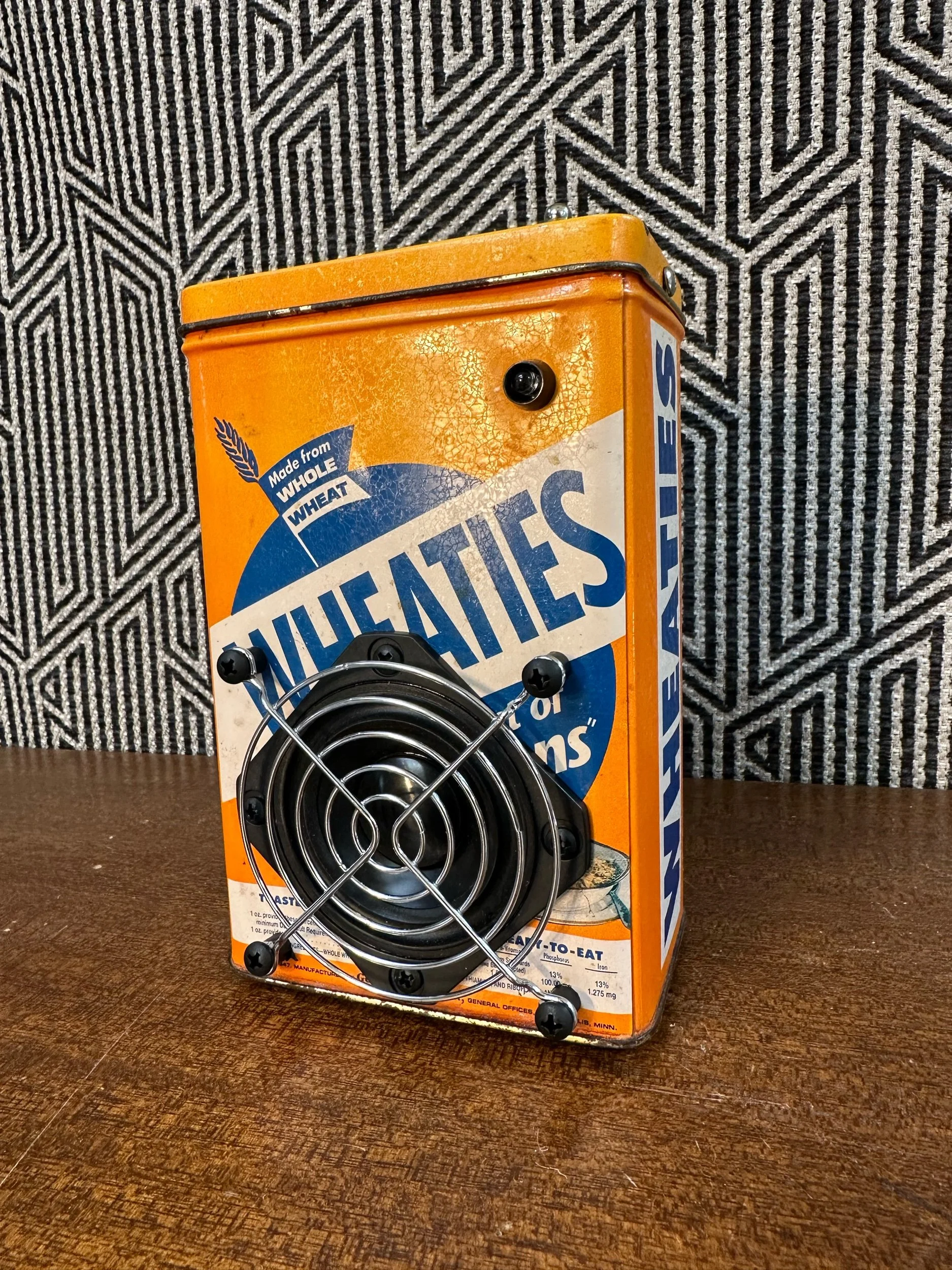 Crafted from vintage Lunch Box. This one in particular was very well loved which adds to it’s charm. We only use vintage lunch boxes that do not have much value on their own so as not to devalue anything. These are cleaned, re sealed and meticulously insulated to create a warm sound in a metal box.